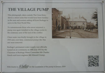 As part of the end of World War One Centenary Commemorations a replica of the village pump was unveiled close to its original location near the Cross Keys public house on 20 February 2019. The plaque reads: